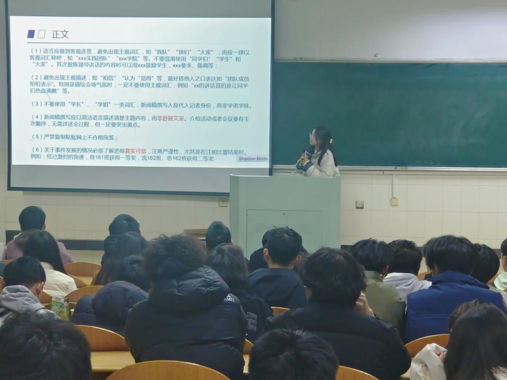 在阶教201组织开展宣传工作培训会。会议由院青年媒体中心主讲,团委学生会各部门200余人参加。