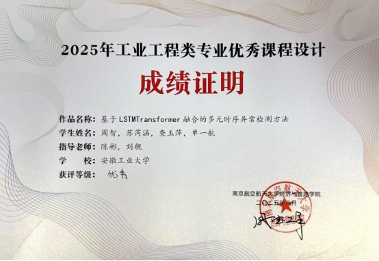 学生周智、苏芮涵、查玉萍、单一航所提交的《基于LSTMTransformer融合的多元时序异常检测方法》课程设计作品在初赛获评“优秀”等级,并成功入围总决赛,指导教师为陈彬和刘舰老师。