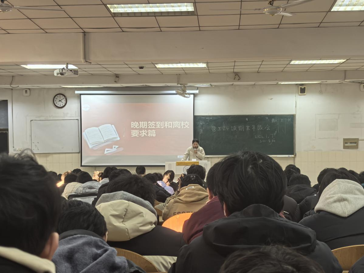 在阶教101召开2024级“明纪守规安全笃行”期末年级会,会议由2024级辅导员李军慧、孙如梦主持,2024级全体学生参加。